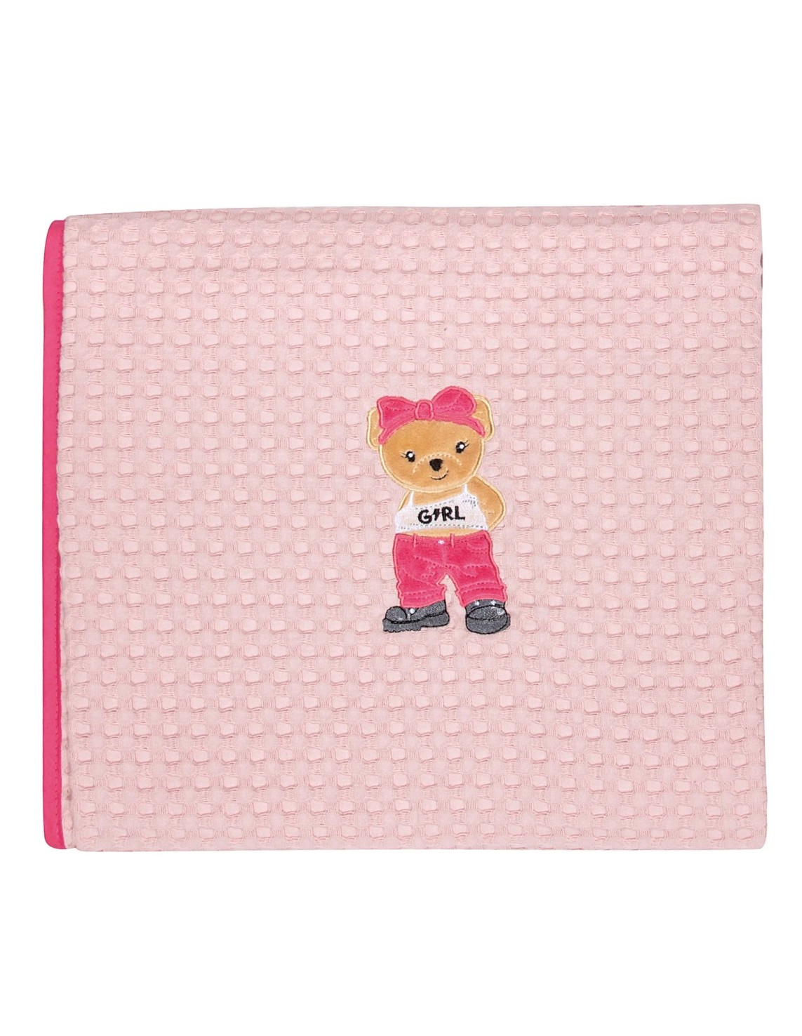 Greenwich Polo Club Essential Serisi pembe ve fuşya renk detaylı bebek pike battaniyesi, %100 hipoalerjenik pamuk kumaşıyla hem yumuşaklık hem de dayanıklılık sunar.