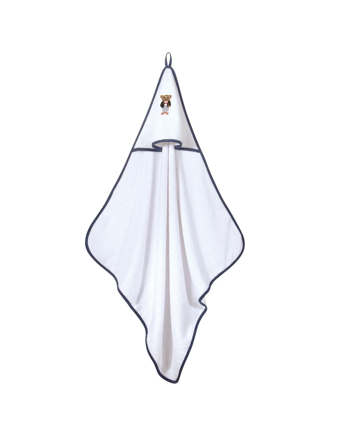 Greenwich Polo Club Essential Serisi beyaz ve mavi renkli kapüşonlu banyo havlusu, %100 hipoalerjenik pamuk kumaştan üretilmiştir.